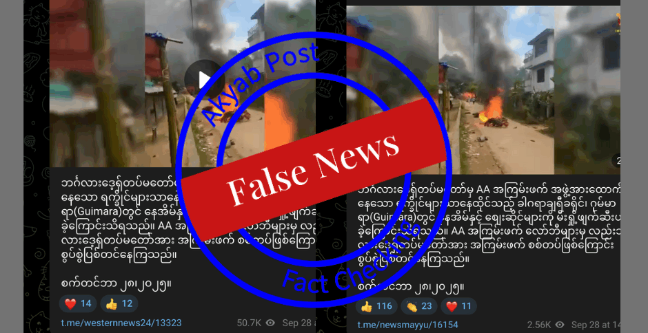 တယ်လီဂရန်မှာ စစ်ကောင်စီဝါဒဖြန့်ချန်နယ်တစ်ခုဖြစ်တဲ့ Western 24 News ကနေ စက်တင်ဘာလ ၂၈ ရက်နေ့မှာ “ဘင်္ဂလားဒေ့ရှ်တပ်မတော်မှ အေအေ အကြမ်းဖက် အဖွဲ့အားထောက်ပံ့နေသော ရက္ခိုင်များသာနေထိုင်သည့် ခါဂရာချရီခရိုင်၊ ဂုမ်မာရာ(Guimara)တွင် နေအိမ်နှင့် စျေးဆိုင်များကို မီးရှို့ဖျက်ဆီးပစ်ခဲ့ကြောင်းသိရသည်။ အေအေ အကြမ်းဖက် လော်ဘီများမှလည်း ဘင်္ဂလားဒေ့ရှ် တပ်မတော်အား အကြမ်းဖက် စစ်တပ်ဖြစ်ကြောင်းစွပ်စွဲပြစ်တင်နေကြသည်။” ဆိုပြီးတော့ ရုပ်သံဖိုင်တစ်ခုနဲ့ ဖြန့်ချိထားပါတယ်။