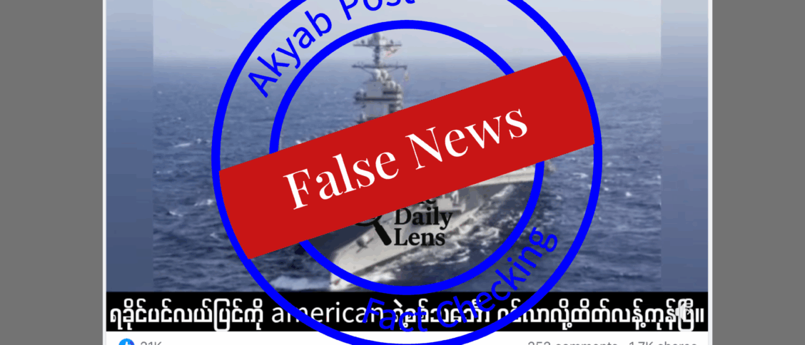 ပျံ့နှံ့နေတဲ့ ပို့စ်ကို Myanmar Fact-checking Network အဖွဲ့ဝင်ဖြစ်တဲ့ Akyab Post ကနေ စစ်ဆေးကြည့်လိုက်တဲ့အခါမှာ အမေရိကန်စစ်သင်္ဘော ရခိုင်ပင်လယ်ပြင်ကို ဝင်လာပြီဆိုတာဟာ မှန်ကုန်မှုမရှိတဲ့ သတင်းတုသတင်းမှားဖြစ်နေတာကို တွေ့ရပါတယ်။