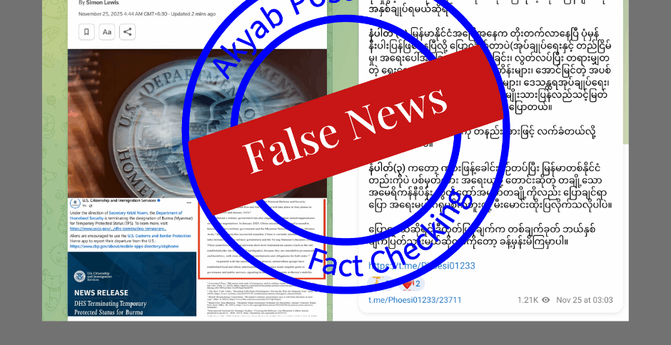 ဒီပို့စ်ကို MFCN အဖွဲ့ဝင်ဖြစ်တဲ့ Akyab Post ကနေ စစ်ဆေးကြည့်လိုက်တဲ့အခါမှာ စစ်ကောင်စီဝါဒဖြန့် ချန်နယ်တွေမှာ အမေရိကန်နိုင်ငံကနေ မြန်မာနိုင်ငံသားတွေကို ပေးအပ်ထားတဲ့ အရေးပေါ်ခိုလှုံခွင့်ကို ရပ်ဆိုင်းလိုက်တဲ့ ကိစ္စကိုအခြေခံပြီးတော့ အမေရိကန်နိုင်ငံက ရွေးကောက်ပွဲကို ထောက်ခံပါတယ်ဆိုပြီး လုပ်ကြံထားတဲ့ သတင်းတုသတင်းမှားဖြန့်ခဲ့တာကို တွေ့ရပါတယ်။