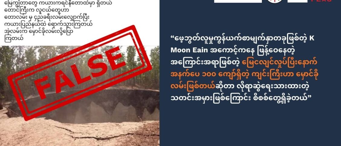 ဖေ့ဘွတ်လူမှုကွန်ယက်စာမျက်နှာတခုဖြစ်တဲ့ K Moon Eain အကောင့်ကနေ ဖြန့်ဝေနေတဲ့ အကြောင်းအရာဖြစ်တဲ့ “ မေငလျင်လှုပ်ပြီးနောက် အနက်ပေ ၁၀၀ ကျော် ရှိတဲ့ ကျင်းကြီးဟာ မှောင်ခိုလမ်းဖြစ်တယ်”ဆိုတာ လိုရာဆွဲရေးသားထားတဲ့ သတင်းအမှားဖြစ်ကြောင်း စိစစ်တွေ့ရှိခဲ့တယ်။