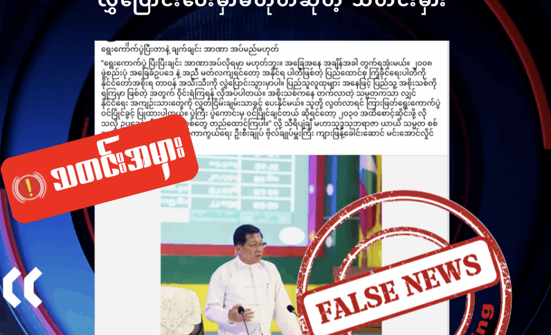 “ရွေးကောက်ပွဲပြီးတာနဲ့ ချက်ချင်း အာဏာ အပ်မည်မဟုတ်” ဆိုတဲ့အကြောင်းအရာက စစ်တပ်ကိုသရော်ရေးသားထားတဲ့ သတင်းမှားတခုသာ ဖြစ်ပါတယ်။