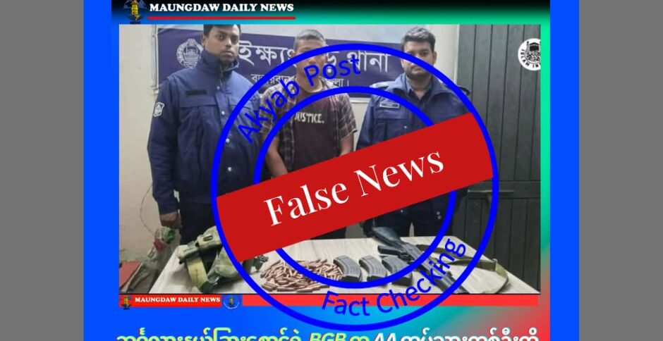 စိတ်ချယုံကြည်ရတဲ့ သတင်းဌာနတွေရဲ့ ရေးသားဖော်ပြချက်တွေ၊ ဘင်္ဂလားဒေ့ရ်ု သတင်းမီဒီယာတွေရဲ့ ရေးသားဖော်ပြချက်တွေနဲ့ တိုက်ပြီးစစ်ဆေးကြည့်တဲ့အခါမှာ Maungdaw Daily News- အရံ page အပါအဝင် စစ်ကောင်စီဝါဒဖြန့်ချန်နယ်တွေမှာ ပျံ့နေတဲ့ ပို့စ်ဟာ ဘင်္ဂလားဒေ့ရှ်ဖက်မှနေ မြန်မာနိုင်ငံသားတစ်ဦးလက်နက်နဲ့အတူ နယ်စပ်ဖြတ်ကျော်ပြီး ဝင်ရောက်လာတာကို လိုအပ်သလို ပုံဖော်ရေးသားကာ သတင်းတုသတင်းမှားဖြန့်ခဲ့တာကို တွေ့ရပါတယ်။