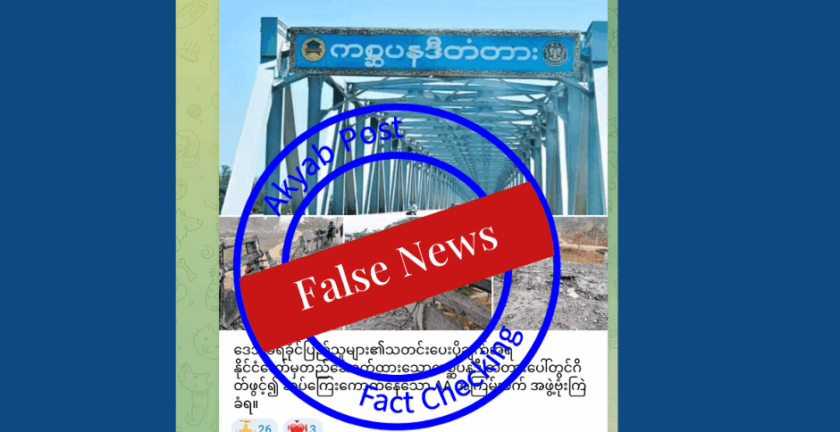 စစ်ကောင်စီဝါဒဖြန့်ချန်နယ်တွေမှာ ပျံ့နှံ့နေတဲ့ ပို့စ်ကို MFCN အဖွဲ့ဝင်ဖြစ်တဲ့ Akyab Post ကနေ စစ်ဆေးကြည့်လိုက်တဲ့အခါမှာ လေကြောင်းတိုက်ခိုက်မှုအတွင်း ပျက်စီးခဲ့တာဟာ အရပ်သားပြည်သူတွေ အသုံးပြုနေကြတဲ့ တံတားသာဖြစ်ပြီးတော့ အေအေစခန်းကို လေကြောင်းတိုက်ခိုက်တယ်ဆိုတာဟာ လုပ်ကြံရေးသားထားတဲ့ သတင်းမှားဖြစ်နေတာကို တွေ့ရပါတယ်။
