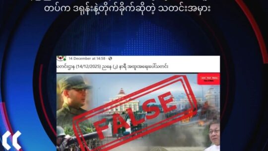 ဒီဇင်ဘာ ၁၄ ရက်နေ့မှာ Pii Videos ဆိုတဲ့ ဖေ့ဘွတ်လူမှုကွန်ယက်စာမျက်နှာက “ နေပြည်တော်ရှိ စစ်တပ်ဝန်ထမ်းအိမ်ရာတွေကို AAပူးပေါင်းတပ်က ဒရုန်းနဲ့ တိုက်ခိုက်တယ်” ဆိုပြီးတော့ ဗီဒီယိုတစ်ခုဖန်တီးပြီး သတင်းအမှားဖြန့်ဝေနေပါတယ်။ အဲ့ဒီ ဗီဒီယိုတစ်ခုကို...