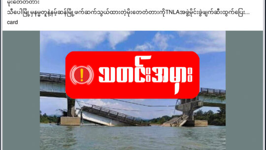 မိုးတေတံတားကို TNLA က မိုင်းခွဲဖျက်ဆီးခဲ့ဆိုပြီး ရုပ်ပုံဟောင်းသုံးထားသည့် သတင်းမှား ၂၀၂၅ခုနှစ်၊ အောက်တိုဘာလ၊ ၁၀ရက်။ (Fact-check _DNA/ The Red Flag) ရှမ်းပြည်နယ်မြောက်ပိုင်း၊ သီပေါမြို့က မိုးတေတံတားကို တအာင်းအမျိုးသားလွတ်မြောက်ရေး...