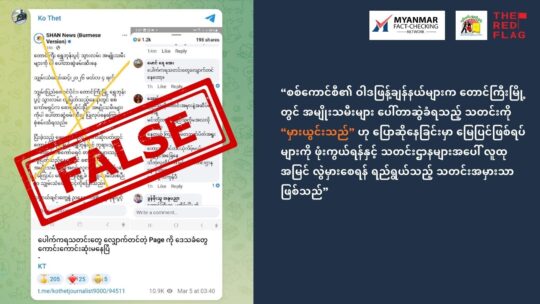 ၂၀၂၆ မတ်လ ၂၅ ရက် (Fact-check / သျှမ်းသံတော်ဆင့်, The Red Flag) ဖေ့ဘွတ်ခ် လူမှုကွန်ရက်စာမျက်နှာများတွင် တအာင်း (ပလောင်) လူမျိုးများက ကိုးကန့်တပ် (MNDAA) အား တအာင်း (ပလောင်) နယ်မြေအတွင်းမှ ထွက်ခွာပေးရန်နှင့် အလိုမရှိကြောင်း...