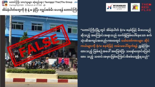၂၀၂၆ မတ်လ ၇ ရက် (Fact- check / သျှမ်းသံတော်ဆင့်, The Red Flag ) သျှမ်းပြည်တောင်ပိုင်း တောင်ကြီးမြို့တွင် အမျိုးသမီးများအား ပေါ်တာဆွဲနေသည်ဆိုသော ဒေသတွင်း သတင်းဌာနများ၏ ဖော်ပြချက်သည် သတင်းမှားသာဖြစ်ပြီး ဒေသခံများက အဆိုပါသတင်းဌာနကို...