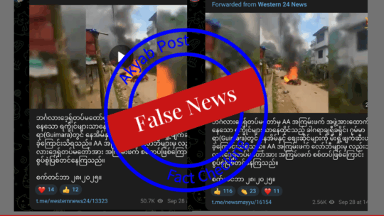 The Akyab Post/ The Red Flag/MFCN Fact-Check 29 Sep 2025 ရခိုင်ပြည် သံတွဲမြို့က အေအေစခန်းကို လေကြောင်းနဲ့ဗုံးကြဲတိုက်ခိုက်ပြီး အေအေတပ်ဖွဲ့ဝင်များ သေဆုံး ဆိုပြီးတော့ ရေးသားထားကြတဲ့ ပို့စ်တွေဟာ စစ်ကောင်စီဝါဒဖြန့်ချန်နယ်တွေမှာ ပျံ့နှံ့လျက်ရှိပါတယ်။ ...