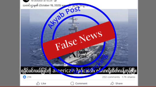 ရခိုင်ပင်လယ်ပြင်ကို အမေရိကန်ရဲ့ စစ်သင်္ဘောဝင်ရောက်လာပြီဆိုတဲ့ သတင်းမှား 23 Oct 2025 Fact-check_ Akyab Post/ The Red Flag/ MFCN ▪️အနှစ်ချုပ် “Jay Videos” ဆိုတဲ့ Facebook Page ကနေ တင်ထားတဲ့ ရခိုင်ပင်လယ်ပြင်ကို အမေရိကန်ရဲ့ စစ်သင်္ဘော...