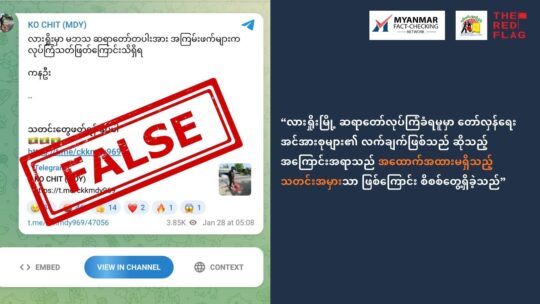 ၂၀၂၆ ဇန်နဝါရီလ ၂၉ ရက် (သျှမ်းသံတော်ဆင့်, The Red Flag) သျှမ်းပြည်မြောက်ပိုင်း လားရှိုးမြို့တွင် ဆရာတော်တစ်ပါး လုပ်ကြံသတ်ဖြတ်ခံရသည့် ဖြစ်စဉ်အပေါ် အခြေခံ၍ စစ်တပ်ဝါဒဖြန့်တယ်လီဂရမ်ချန်နယ်များက တော်လှန်ရေးအင်အားစုများ၏ လက်ချက်ဖြစ်သည်ဟု...