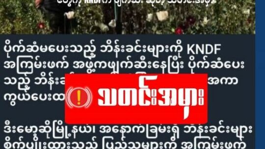 ၂၀၂၆ခုနှစ်၊ ဖေဖော်ဝါရီ ၁၆ ရက် ဖက်ဒရယ် FM/ MFCN မှိုင်းဝေတယ်လီဂရမ်ချန်နယ်ကနေ “ KNDFက ကရင်နီပြည်၊ ဒီးမော့ဆိုမြို့နယ်၊ အနောက်ခြမ်းရှိ ဘိန်းခင်းတွေ စိုက်ပျိုးထားတဲ့ ပြည်သူတွေကို ဘိန်း၁ဧကကို သိန်း ၁၀၀ တောင်းနေပြီးတော့ ငွေမပေးနိုင်တဲ့ ဘိန်းခင်းတွေကို...